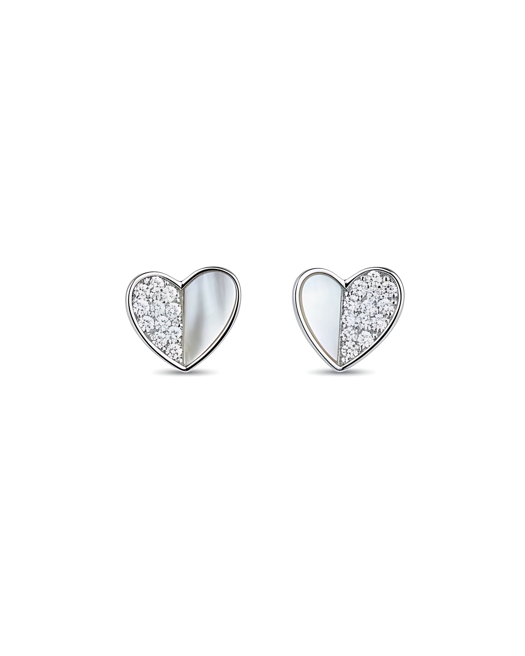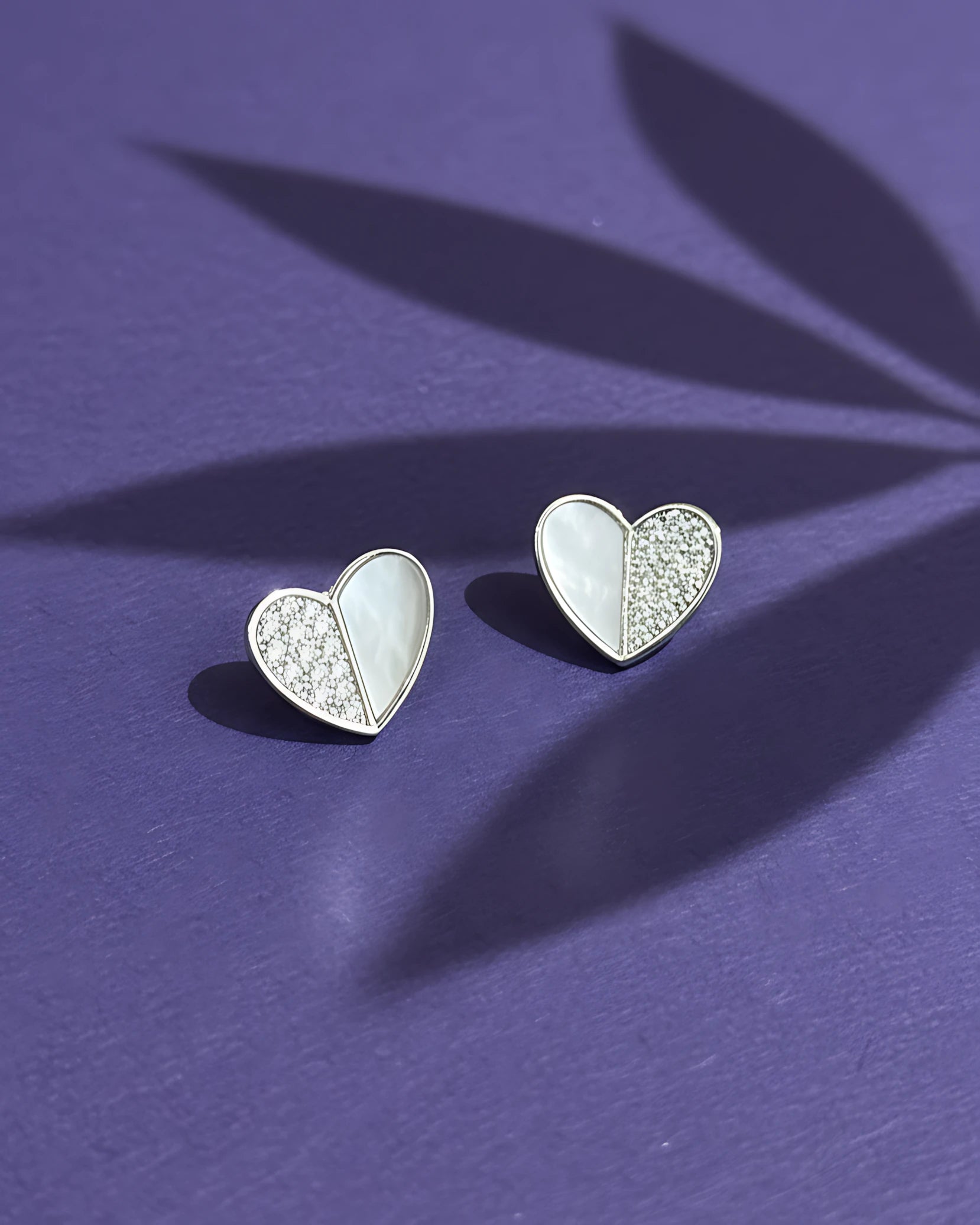 Discover dimensional elegance with 3D Pearl Heart Studs, the unique 925 sterling silver heart earrings featuring an innovative bent-center design that creates stunning three-dimensional depth. Each earring showcases a lustrous mother-of-pearl heart on one side and sparkling micro-set cubic zirconia stones on the other, separated by a distinctive center fold that gives these heart studs incredible visual dimension and modern sophistication.