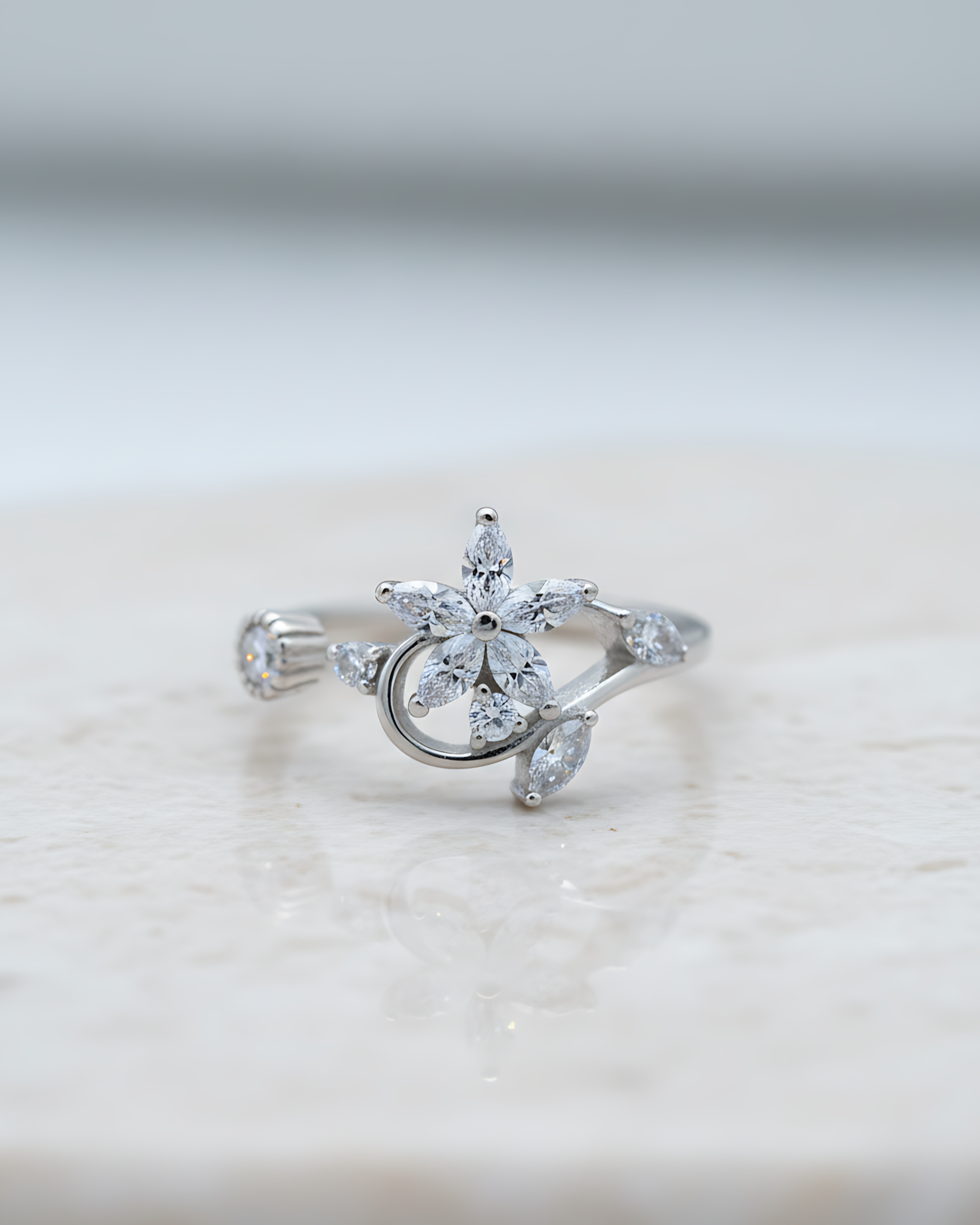The Celestial Bloom Adjustable Ring captures the timeless appeal of floral jewelry with modern adjustable functionality. The marquise cut stones are expertly arranged to form a delicate flower that catches light from every angle, creating a mesmerizing display of brilliance.