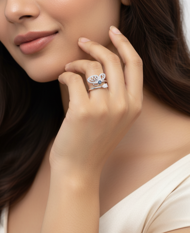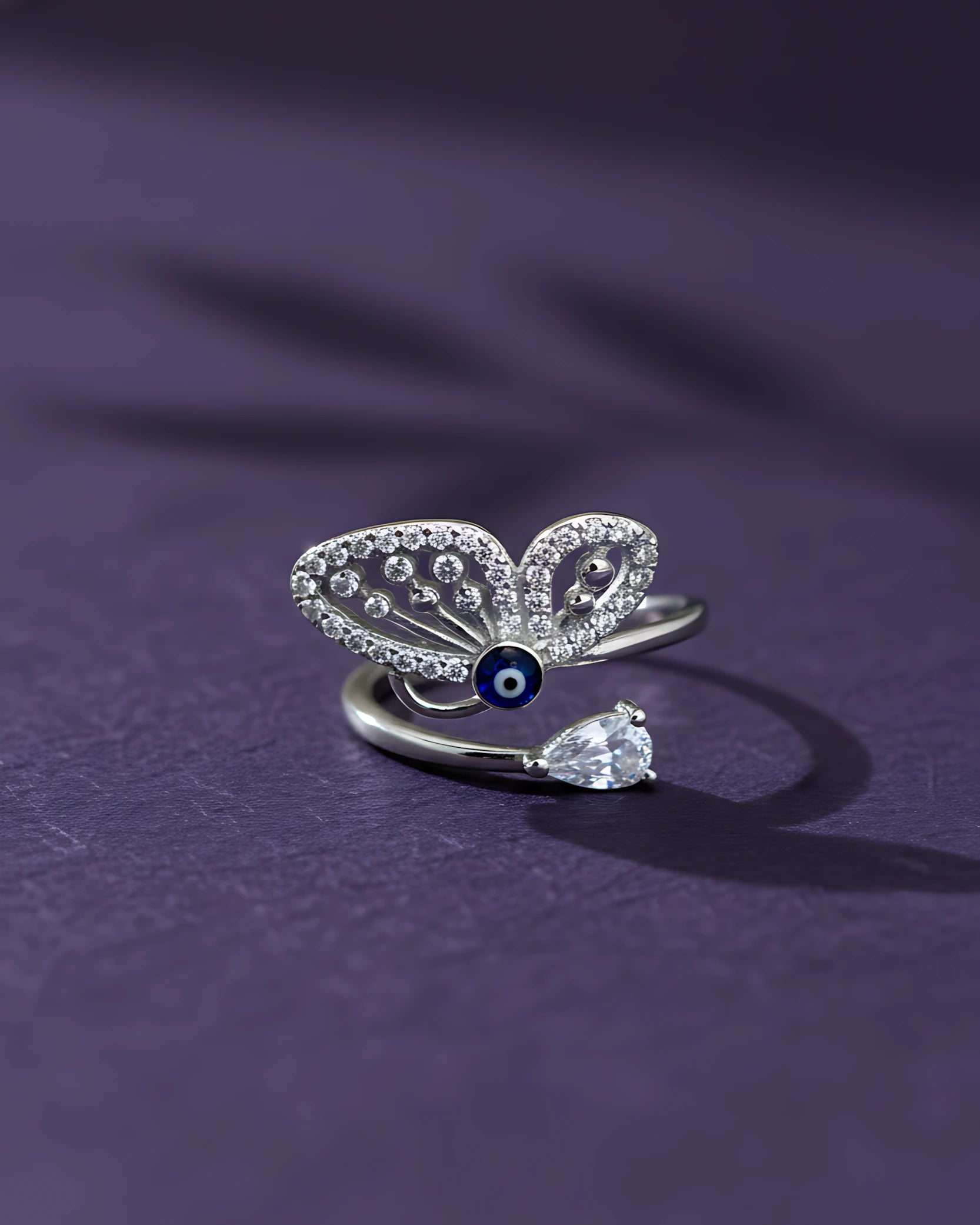 Evil Eye Butterfly Adjustable Ring | 925 Sterling Silver Evil Eye Ring with Butterfly Motif