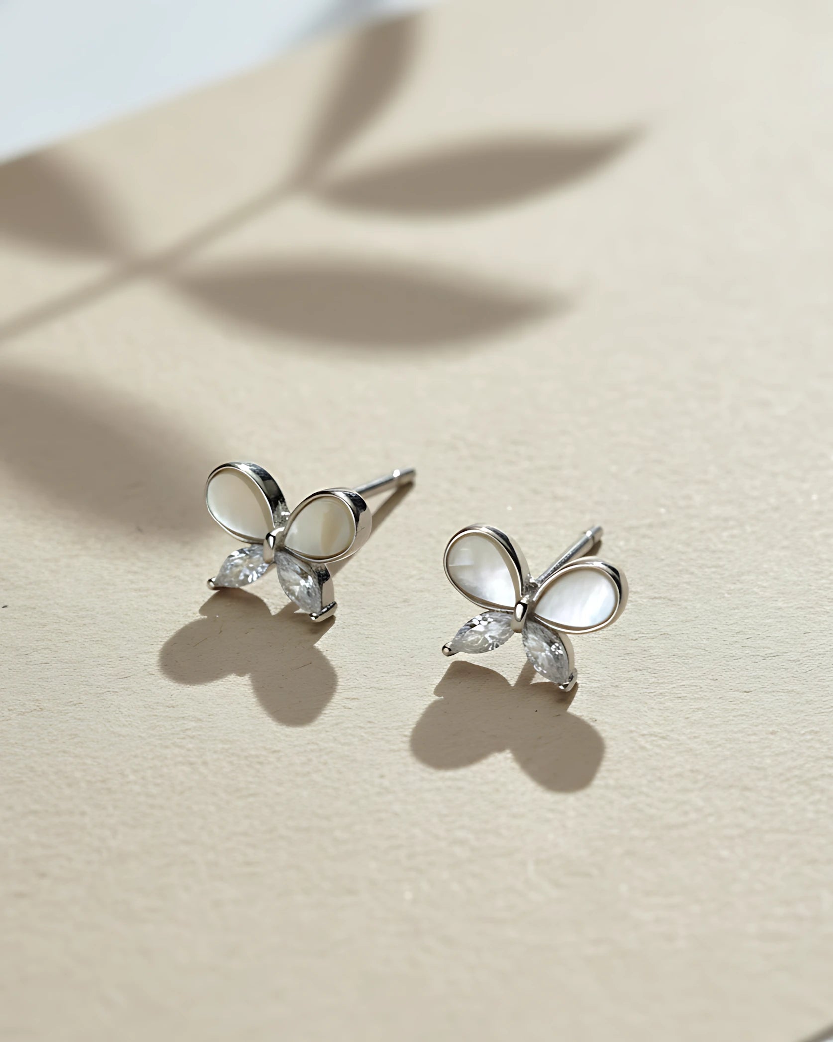 Each butterfly is meticulously handcrafted with attention to detail, featuring precisely set cubic zirconia stones and carefully shaped mother-of-pearl wings. The 925 sterling silver construction ensures durability and hypoallergenic properties, while rhodium plating maintains brilliant shine.