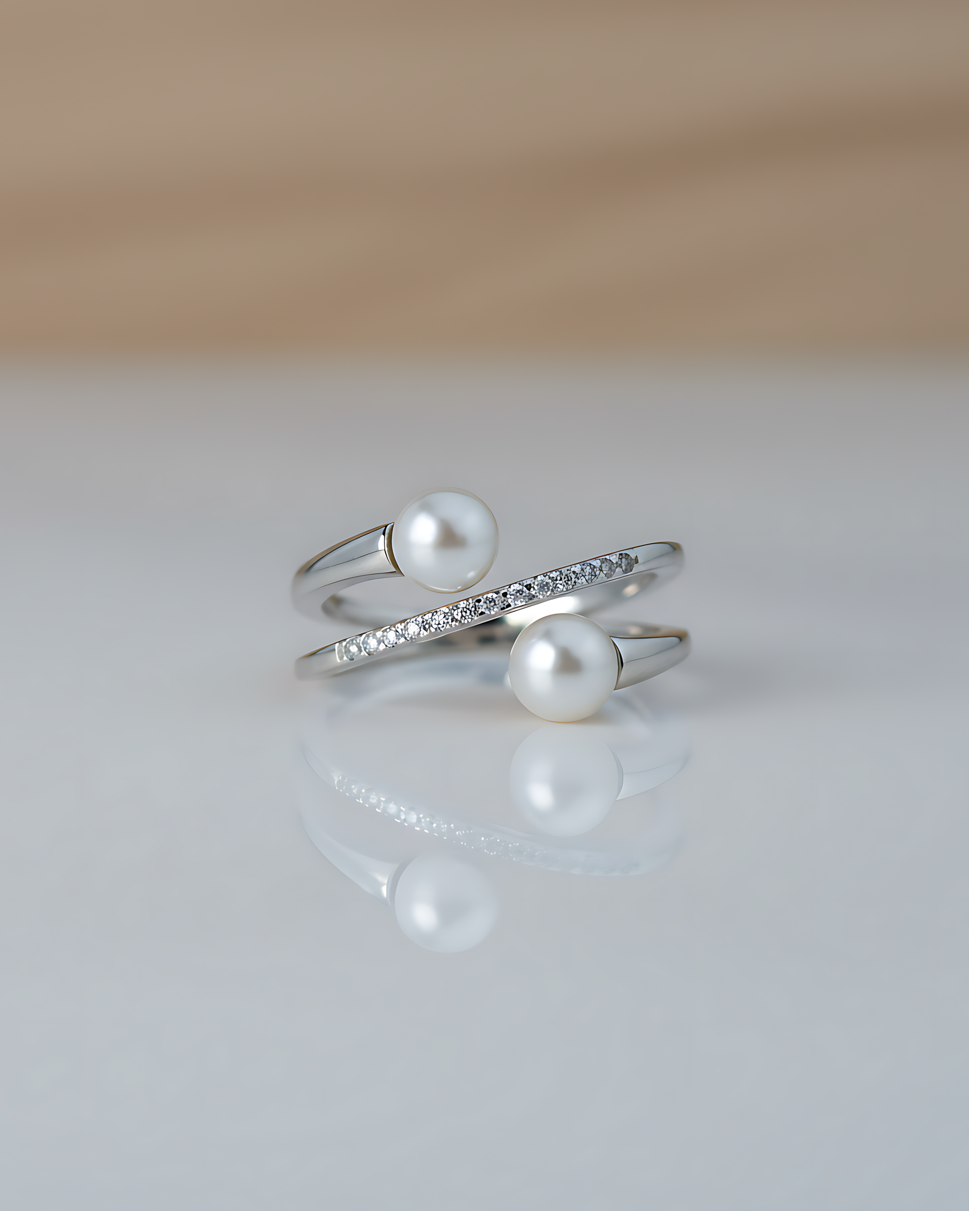 Discover the Pearl Duo Wrap Ring, a beautifully crafted sterling silver band that unites two lustrous freshwater pearls with a delicate row of sparkling cubic zirconia accents. The open “wrap” silhouette creates a contemporary, sculptural look that hugs the finger comfortably while showcasing the harmonious contrast of smooth pearls and brilliant stones.