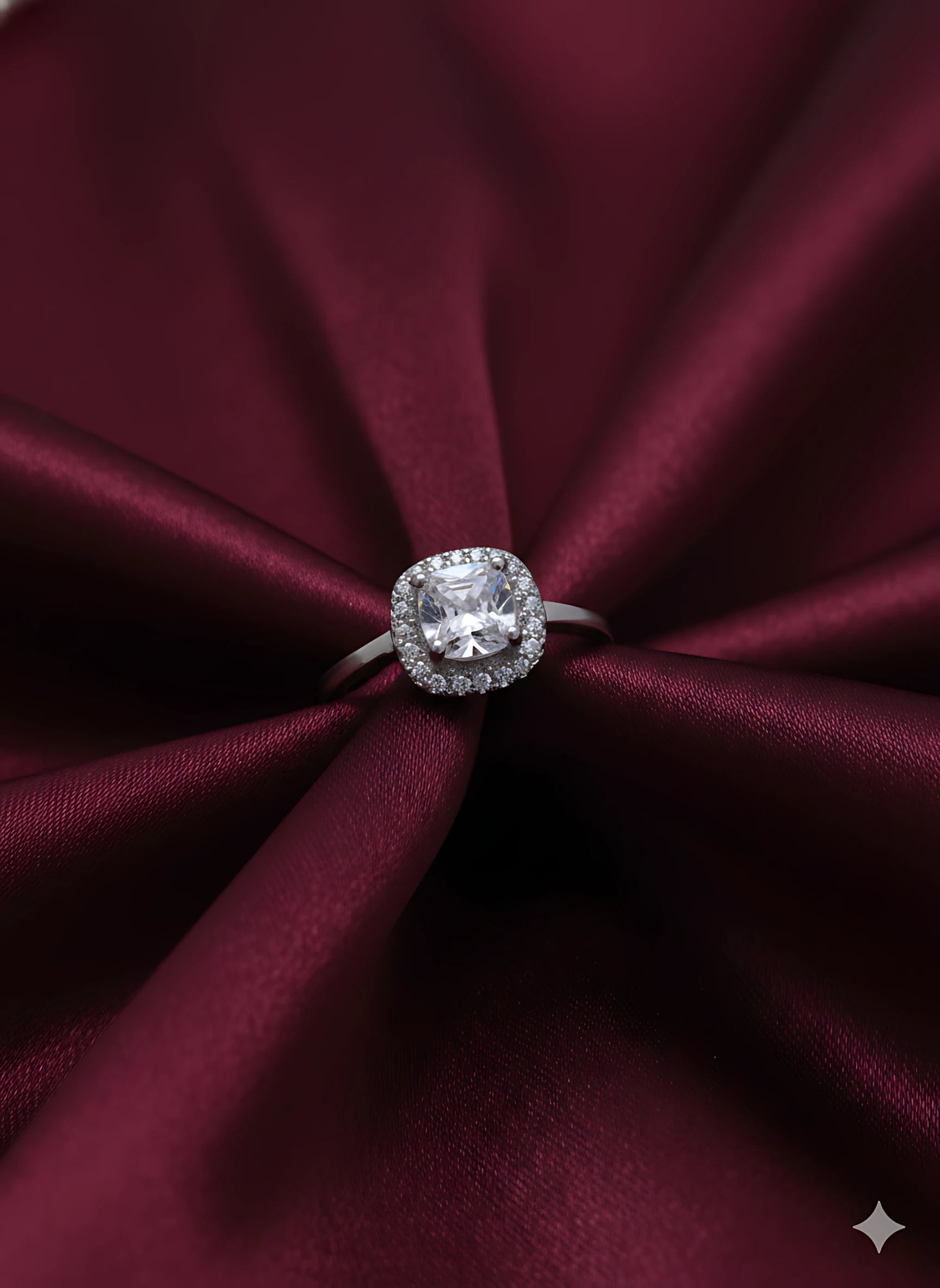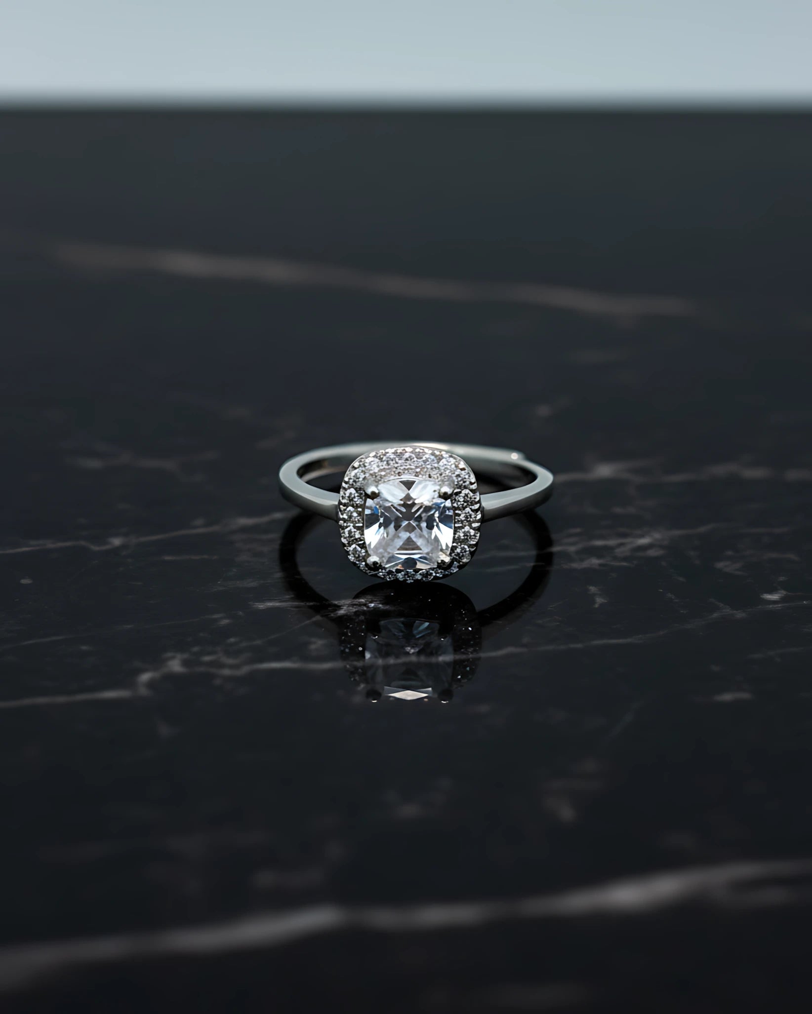 Enjoy the luxury look of a statement silver ring that always fits. This adjustable halo ring is trending for engagement, gifting, and fashion wear- while the cushion-cut design guarantees attention and sparkle at every angle.