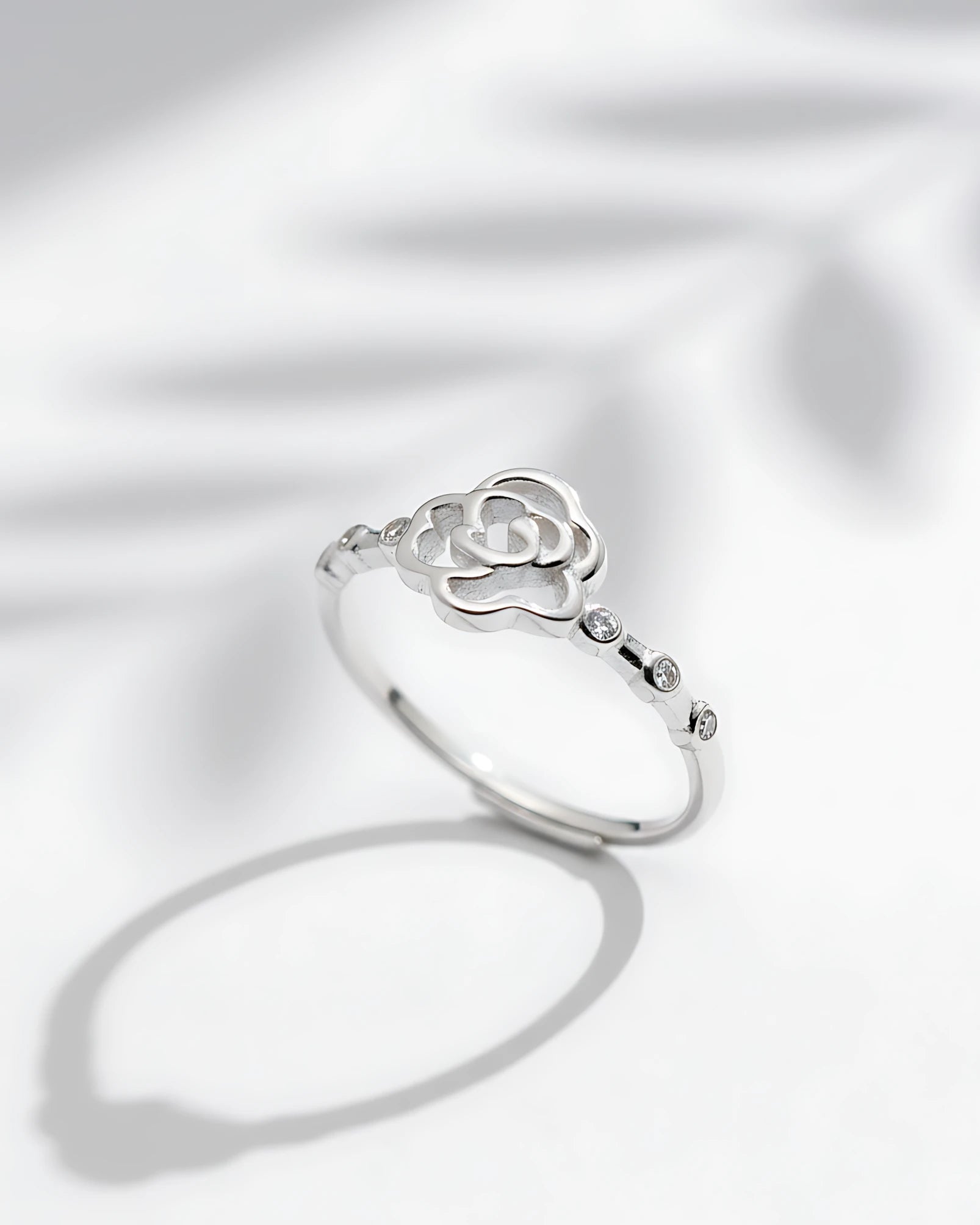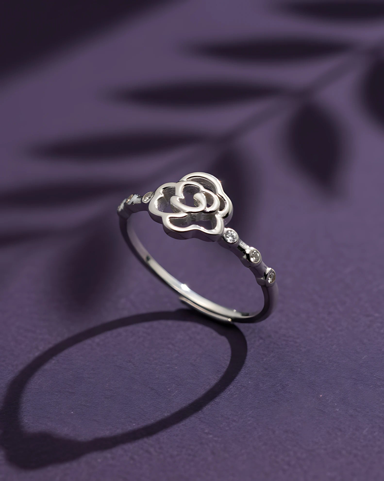 SEO Keywords: adjustable rose ring, sterling silver rose ring, floral CZ ring, open band ring, women’s silver ring, 925 silver flower ring, daily wear ring, nature motif ring, romantic silver jewelry.